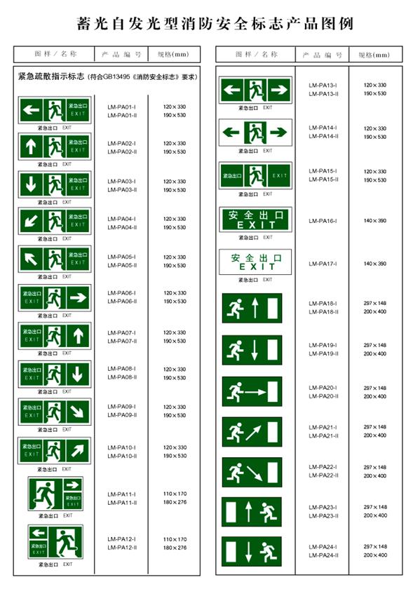產(chǎn)品系列   蓄光自發(fā)光型消防安全標志包括:疏散通道、疏散樓梯、緊急出口、障礙物、消防器材標志以及警示、禁止、指令性標志。