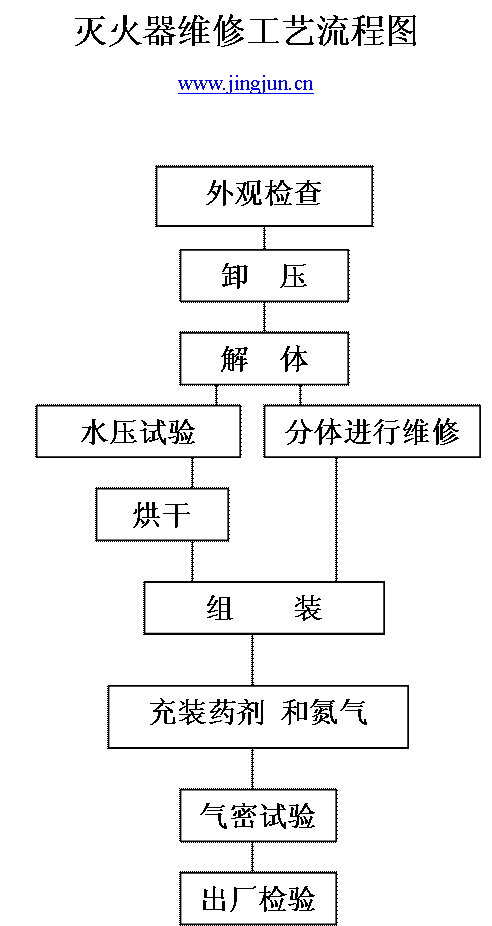 外觀(guān)檢查--卸壓--解體--水壓試驗--分體進(jìn)行維修--筒體烘干--組裝--充裝藥劑、氮氣--氣密試驗--出廠(chǎng)檢驗;維修滅火器(年檢)包括: 1,滅火器檢測(卸壓打開(kāi)滅火器檢測器頭、閥門(mén)、虹吸管、壓力表性能是否正常,并更換損壞的配件);2,滅火器筒體水壓試驗,測試滅火器筒體在2.5MP的壓力下是否變形報廢,檢測滅火器筒體是否銹化腐蝕;3,烘干滅火器筒體;4,重新灌裝滅火藥劑并稱(chēng)重計量,更換變質(zhì)的滅火藥劑;5,重新充裝驅動(dòng)氣體氮氣壓;6,密封器頭后做噴射性能檢查、氣密性能檢查;7,滅火器筒體外部的清潔清洗;8,貼當地消防局認可的 滅火器維修年檢合格證 標簽